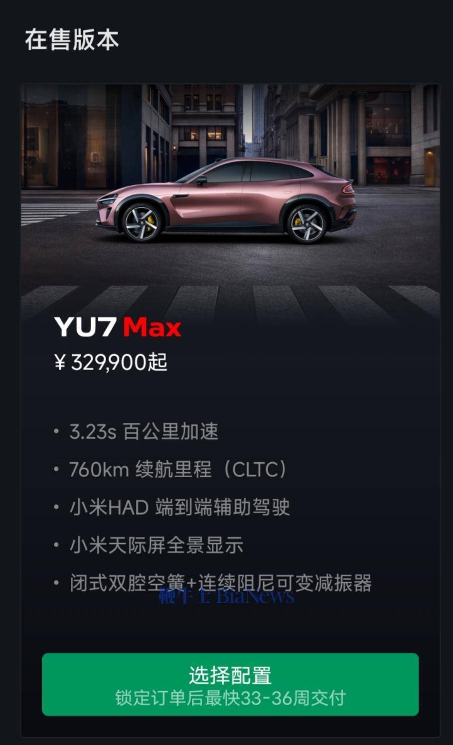 YU7 Max锁单后最快33-36周交付。