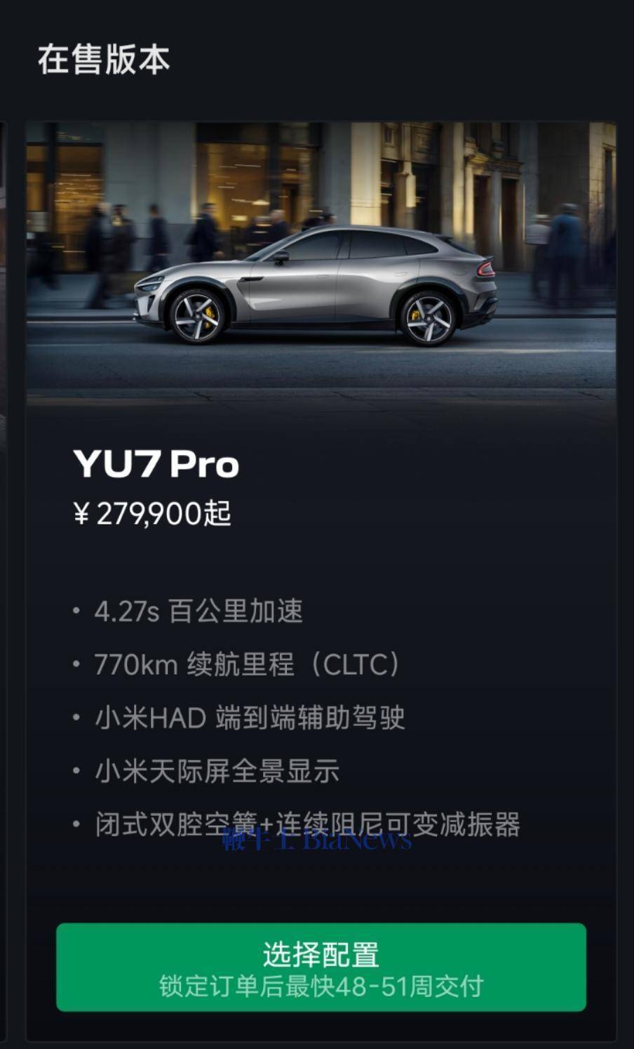 YU7 Pro锁单后最快48-51周交付。