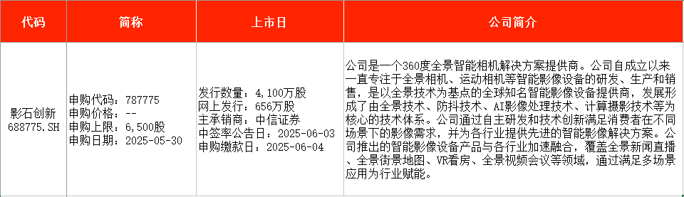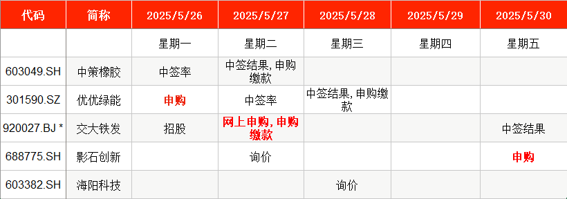 从时间表看,优优绿能在周一(5月26日)申购,影石创新则在周五(5月30日)申购。