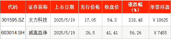 5月19日,太力科技在深圳证券交易所(下称“深交所”)创业板正式挂牌上市,发行价为17.05元/股,截至上市首日收盘,该股报54.3元/股,涨幅为218.48%。以收盘价计算,投资者中一签浮盈为1.86万元。