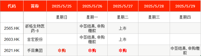 Wind数据显示,派格生物医药-B(02565.HK)、吉宏股份(02603.HK)均在本周二(5月27日)上市,手回集团(02621.HK)将于本周一至周二(5月26日至5月27日)继续申购。