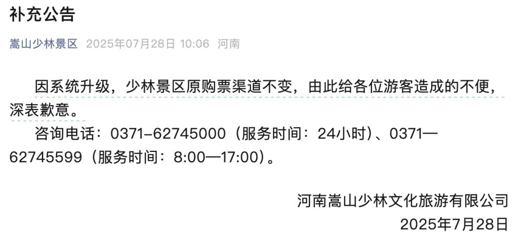 河南嵩山少林文化旅游有限公司7月28日发布补充公告:因系统升级,少林景区原购票渠道不变,由此给各位游客造成的不便,深表歉意。