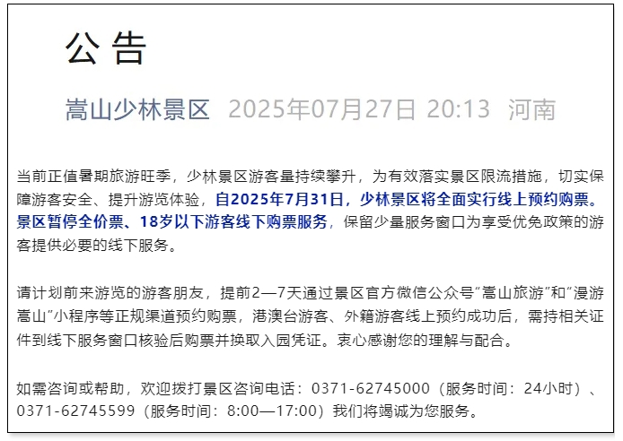 7月27日晚,河南嵩山少林文化旅游有限公司公告称:当前正值暑期旅游旺季,少林景区游客量持续攀升,为有效落实景区限流措施,切实保障游客安全、提升游览体验,自2025年7月31日,少林景区将全面实行线上预约购票。景区暂停全价票、18岁以下游客线下购票服务,保留少量服务窗口为享受优免政策的游客提供必要的线下服务。该公告目前已删除。